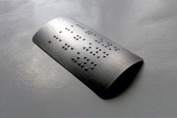 Metal signs for handrails - durable and aesthetic solution suitable for both round and rectangular profile handrails.